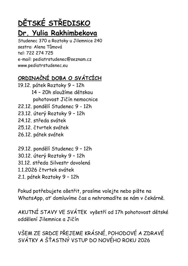 Dětská ordinace Studenec provoz vánoce 2025