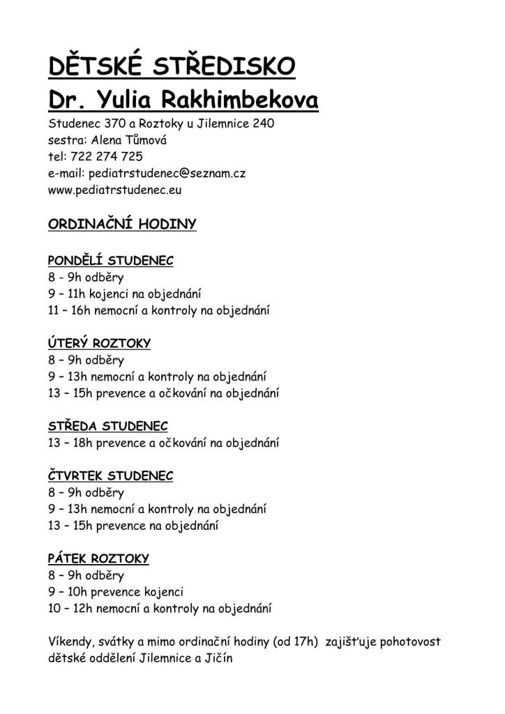změna ordinačních hodin dětské lékařky