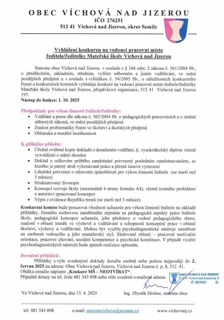 Vyhlášení konkurzu na ředitelku MŠ Víchová n. J.